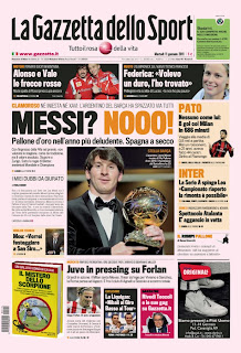 Ahora nos rasgamos las vestiduras, porque en año de Mundial siempre se ha premiado a un jugador del equipo campeón desde que se dan premios a jugadores no europeos: Zidane (1998) Ronaldo (2002) y el más que discutido Cannavaro (2006). Con más o menos razón, fueron los líderes claros de esos equipos. Y, por supuesto, nos quejábamos de la elección de Cannavaro, que sólo por el Mundial no se lo merece. Tres cuartos de lo mismo se puede decir de Iniesta (y que conste que yo adoro a Iniesta) pero como es español no se dice. Otros dos apuntes más: la vergonzosa portada de La Gazzetta dello Sport, aquí expuesta, no es más que una pataleta del prestigioso diario italiano. En las anteriores ediciones, se filtra el resultado del ganador y La Gazzetta lo anuncia en primicia. Como en esta ocasión les ha salido el tiro por la culata, la Fifa ha sabido mantener el resultado final en el más absoluto de los secretos, pues se han enfadado. No les ha sentado bien. Típico del periodismo actual, que se exaltan en cuanto les llevan la contraria, porque se creen que lo saben todo y están en un pedestal. La segunda reflexión viene porque en España y en esa prensa amarillista, hay una envidia malsana hacia todo lo que huela a blaugrana. Como no se lo han dado a ninguno de los españoles- y a buen seguro de haber sido así, hubieran ninguneado al Barça y a la Masía, todos los méritos se los hubieran concedido a la Roja- les ha escocido y mucho. Simplemente hay que hacer dos preguntas: ¿han llorado porque le hayan dado el premio a Mourinho en lugar de a Del Bosque? No. ¿Si el ganador en vez de Messi, con Iniesta y Xavi como candidatos, hubiera sido Cristiano Ronaldo habrían llorado? Fin de mi argumentación.